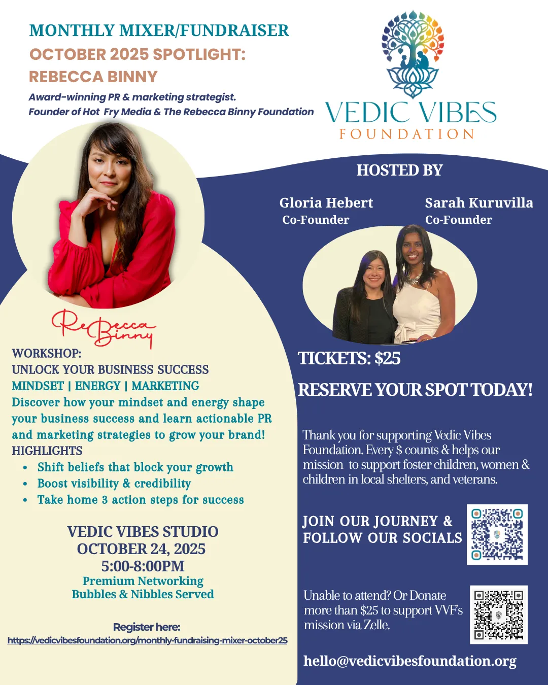 Join us each month at the Vedic Vibes Studio for a transformational evening of connection, community and fundraising to support underserved communities who live amongst us. We have many new exciting announcements to make on Vedic Vibes Foundation and the exciting events planned through the year end. But more importantly, we are thrilled to have Rebecca Binny, founder of Hot Fry Media and The Rebecca Binny Foundation lead a workshop Unlock Your Business Success. More details in the flyer.